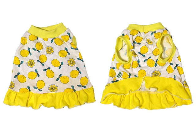 レモンの爽やかさや、酸っぱさが伝わってくるようなタンクトップです。 黄色でまとめているタックトップは、着ているだけでレモンに見えてきそうです。 脇の部分は、れもんの生地は使わず、腕、首回りと同じ色を使った切り替え仕様にして スポーティーですっきりとした印象になっています。 首回りのリブは約4cmと首のファーが立派なワンちゃんも、首のリブが少し見えるところもポイントです。 通常のタンクトップもあるのですが、このページは女の子の為にスカート付き 1段スカートをつけることにより女子力大幅アップとなります