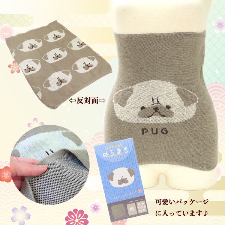 表裏で違うパグちゃんのデザインが楽しめるお腹あったか腹巻きです。