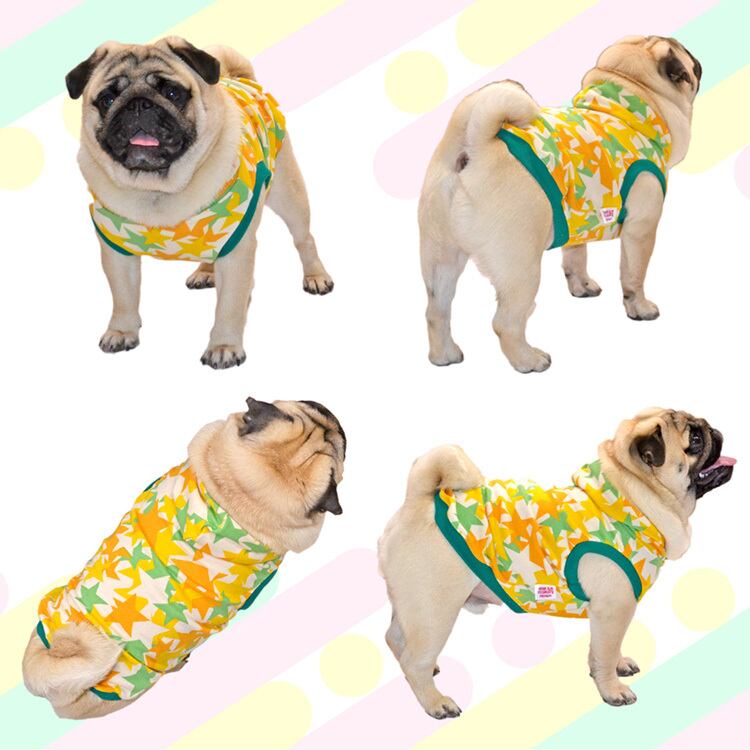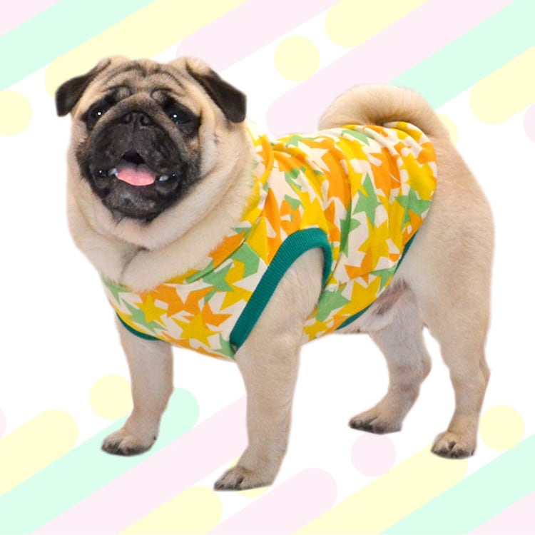 黄色と緑の星が散りばめられた生地は、ミニ裏毛で通常の裏毛生地よりは少し薄手なので