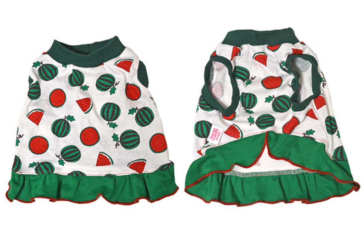 スイカをイメージさせるグリーンで統一されたタンクトップはですが、生地には丸々のスイカやカットされたスイカがプリントされています。