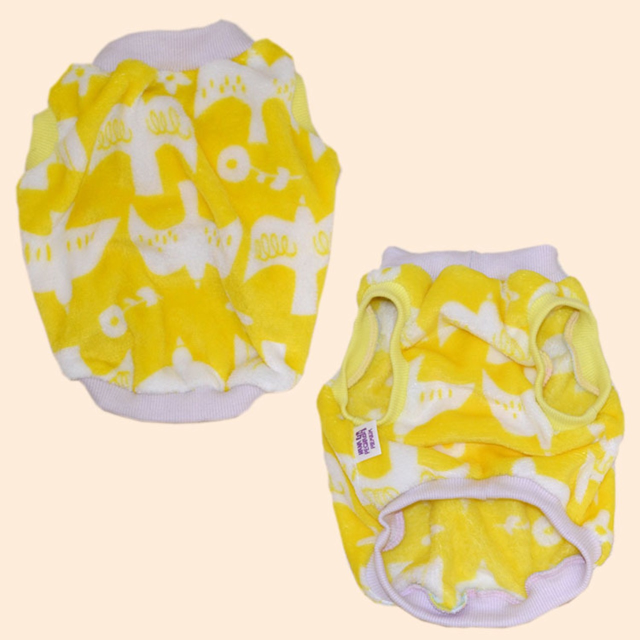 黄色のフリースに白い鳥が飛んでいるような生地は、柔らかふわふわで着心地は抜群です。