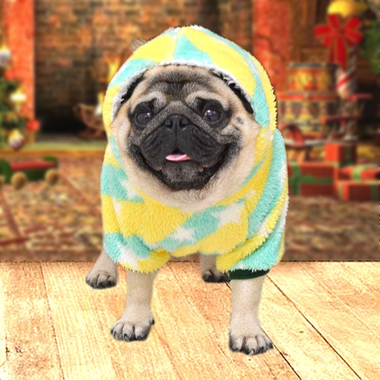 クリスマス仕様のパグちゃん生地と暖かもこもこ生地を組み合わせた見た目も中身も温かい